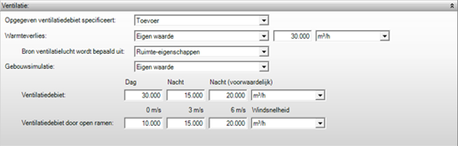 In het ventilatiesjabloon geef je de ventilatiecapaciteit op. Je kunt hier aangeven of de opgegeven ventilatiedebiet toevoer of afvoer betreft. Daarnaast is het voor Ventilatiestromen Warmteverlies belangrijk om bij Ventilatie ‘Warmteverlies’ op ‘Eigen waarde’ te zetten en ‘Bron ventilatielucht wordt bepaald uit’ op ‘Ruimte-eigenschappen’. Voer vervolgens de ventilatiehoeveelheden in.
