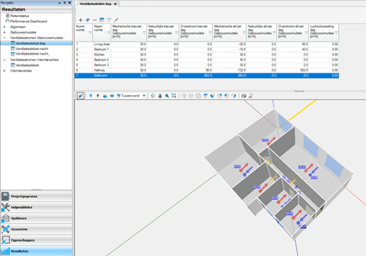 In het resultatenscherm kun je voor Warmteverlies en Gebouwsimulatie de ventilatiestromen zien. De invoer van je ventilatiedebieten krijg je te zien in handige tabellen. Je kunt kiezen voor een tabel met de dag, nacht en/of nacht voorwaardelijk resultaten. Met de tabel heb je een goed overzicht van de ventilatiehoeveelheden per ruimte. Onder de tabel is de 3D weergave van de ventilatiestromen te zien. Zo controleer je snel de ventilatiestromen en zie je gelijk voor welke ruimte en wanneer (dag, nacht of nacht voorwaardelijk) je eventueel iets moet wijzigen.