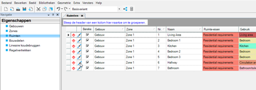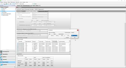 Bij Eigenschappen-Ruimten-Potloodje-tabblad Ventilatie kun je overstromen en luchtuitwisselingen invoeren. Dit doe je apart voor Warmteverlies en Gebouwsimulatie, omdat voor een gebouwsimulatieberekening ook sprake is van nachtventilatie en voorwaardelijke ventilatie. Door op het potloodje te klikken kun je per bouwdeel aangeven wat de overstroom en luchtuitwisseling is.
