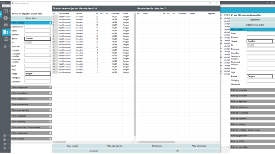 Als je filters in het objecten scherm aanzet dan komen deze ook weer terug in de selectieschermen van de tooling in Assets Energie. Dit is vooral fijn als je in de selectie meerdere filters aan hebt staan die je vervolgens niet elke keer opnieuw in hoeft te vullen. Hierdoor kan je snel schakelen tussen de verschillende mutatietools en rapportages.