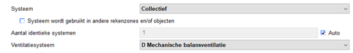 Als we doorgaan op het vorige voorbeeld, zal bij één gemeenschappelijk ventilatiesysteem de invoer 1 zijn. Bij de overige individuele installaties van de aanwezige appartementen wordt dit getal 16. Standaard staat hier het vinkje ‘auto’ aan. In dit geval wordt er bij een individuele installatie in een appartementencomplex het aantal woonfuncties overgenomen dat is ingevuld. Bij gemeenschappelijke installaties wordt dit 1.