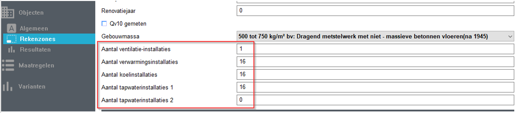 Bij de algemene gegevens van de rekenzone konden vervolgens de afwijkende aantallen opgegeven worden. Bijvoorbeeld als er één gemeenschappelijk ventilatiesysteem aanwezig is, maar de andere installaties individuele toestellen zijn: