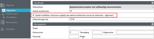 Bij de invoer van een appartementencomplex met zelfstandige wooneenheden werd er standaard gerekend met de situatie dat het aantal installaties gelijk was aan het aantal aanwezige woonfuncties. Wanneer dit anders was, kon dit bij de algemene gegevens van het object worden aangegeven met het selecteren van het vinkje ‘Aantal installaties rekenzone ongelijk aan het aantal woonfuncties’: