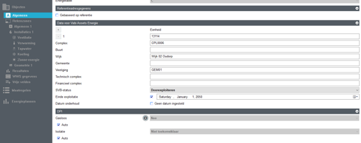 Aan de hand van gegevens die voorhanden zijn wordt er een aanname gemaakt over de status. Het kan zijn dat als er meer informatie over het complex beschikbaar is de status verandert ten opzichte van wat in eerste instantie is aangenomen. In dat geval is het mogelijk om de automatische waardebepaling vanuit Vabi Assets Energie uit te zetten en door een eigen waarde te vervangen.