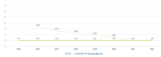 De indicatie van het energielabel geeft nog steeds een integrale beoordeling van de energetische prestatie van woningen. De benchmark laat zien dat dit (op basis van een prognose van de ontwikkeling van de gemiddelde EI NV tussen 2016 en 2020) dat de doelstelling gemiddeld label B (EI van 1,4) eind 2021 werd gerealiseerd.