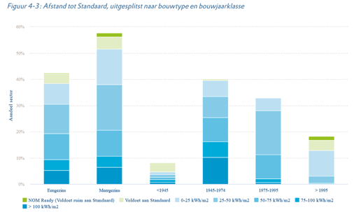 Meer dan de helft van de woningen voldoet of zit binnen 50 kWh/m2 van de Standaard af. Bij meergezinswoningen ligt dit percentage hoger dan bij eengezinswoningen. Bij vooroorlogse woningen voldoen relatief veel woningen aan de Standaard. Dit komt omdat de maximum waarde van de Standaard voor vooroorlogse woningen hoger ligt dan voor naoorlogse woningen.