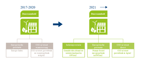Vanaf 2021 geldt een andere systematiek voor de labelbepaling, die niet vergelijkbaar is met de oude methode. Daarnaast zijn er vanuit het Klimaatakkoord uit 2019 andere eisen aan het meten van verduurzaming gesteld. Zo geldt er een nieuw isolatiebeleid: de standaard en streefwaarden. De duurzaamheidsprestatie werd in de periode 2017 tot 2020 met twee indicatoren gemeten: de Energie-Index en de CO2-uitstoot van de warmtevraag (van gas en externe warmte). Vanaf 2021 zijn deze veranderd en is er en derde indicator toegevoegd: de isolatieprestatie.