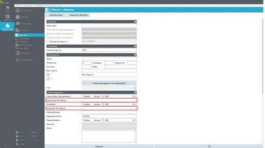 In de huidige software maken we onderscheid tussen bezoekdatum en opnamedatum (datum waarin gegevens verwerkt en ingevuld worden in de software). De opnamedatum werd gestuurd naar RVO. Hierop wordt de 10 jaar geldigheid van het energielabel gebaseerd. Met de NTA 8800 verandert dit. Voor databehoud en overzicht ondersteunen we nog wel twee data (zie eerdere screenshot), dit worden: Opnamedatum (bezoekdatum) en invoerdatum. De bezoekdatum wordt naar RVO gestuurd en hierop zal de 10 jaar geldigheid van het label gebaseerd worden.