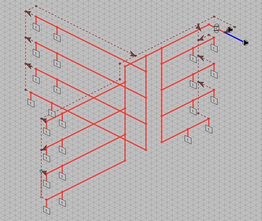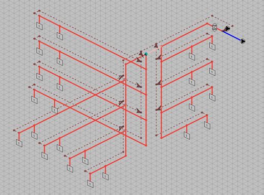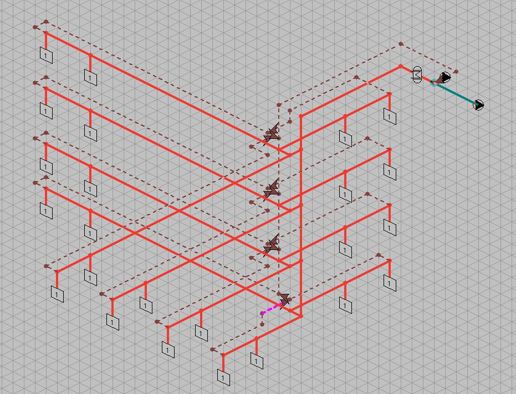 Zo kwamen wij recent een project tegen met een gebouw dat uit meerdere vleugels bestaat. Alle verdieping van deze vleugels zijn via stijgleidingen op elkaar aangesloten. Tevens bevat elk van deze vleugels retourleidingen die op een complexe, niet volgens ISSO 55 toegestane, manier op elkaar aangesloten zijn. Hieronder is dit stelsel te zien.