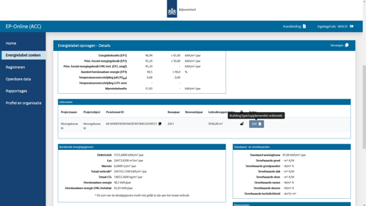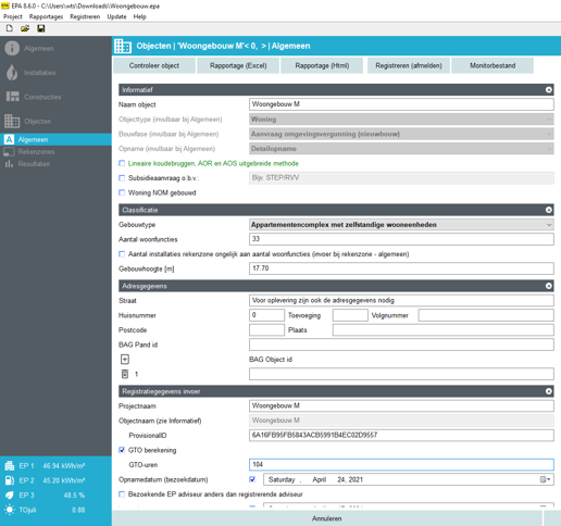 Het appartementencomplex is getoetst aan de BENG-eisen. Voor de woningen in het appartementencomplex zijn de energielabels bepaald en is getoetst aan de TO-juli. We zijn klaar om te registeren! Registreren voor de omgevingsvergunning gaat net wat anders dan voor bestaande bouw en oplevering. Er zijn namelijk nog geen BAG gegevens. Registratie gebeurt daarom op basis van projectnaam en objectnaam. RVO genereert een ‘ProvisionalID’ die je nodig hebt om de registratie eventueel te vervangen voor een alternatieve vergunningsaanvraag. Het energielabel wordt ook door RVO gegenereerd, met uitzondering van het appartementencomplex.