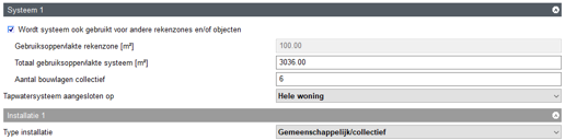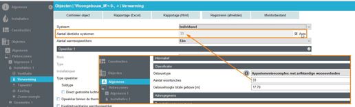 Voor woongebouwen is het aantal installaties van belang voor de rekenresultaten. Dit is bij individuele installaties bijna altijd gelijk aan het aantal woonfuncties. Bij gemeenschappelijke/ collectieve installaties is het er 1. De software bepaalt dit automatisch als het vinkje aan staat. Alleen bij afwijkingen hoeft het aantal ingevuld te worden.