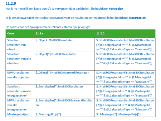 Zoals te zien is in de kolom 11.2.0 is die code nu aangepast. Alle resultaten worden nu uit dezelfde nieuwe resultatenlijst gehaald `Nta8800ResultatenList.Nta8800Resultaten. De code die daarop volgt zijn de toegepaste filters, voorafgaand door ?(@. De filter “@.CalculationType” geeft het verschil tussen de energielabelberekening (Standaard) en maatwerkadvies (Maatwerk). De eerste gebruik je voor alle resulaten met betrekking tot het energielabel, de tweede voor alles wat te maken heeft met de energieverbruiken en resulterende besparingen.