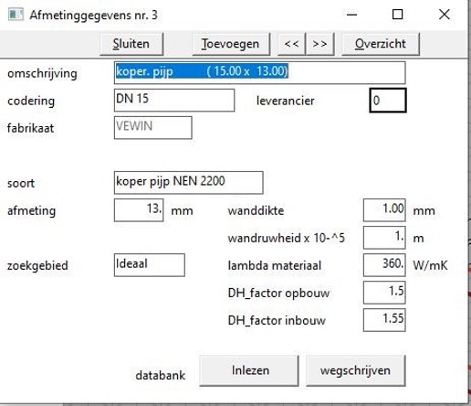 Bij de afmetingen kunnen de DHw,70 _factoren worden opgegeven. De DHw,70 _factor is een maat die aangeeft hoe de verhouding is van de warmte welke doorgegeven wordt naar de volgende leiding en hoeveel warmte naar de omgeving uitstraalt. Volgens Isso55 kunnen dit de waarden uit de tabel II.1 zijn. Dit kan echter per fabrikant verschillen, afhankelijk van de samenstelling van de materialen. Deze waarden kunnen dus ook per diameter anders zijn. Daarnaast kun je het verschil weergeven tussen opbouw en inbouw leidingen. De leidinggegevens zien er dan als volgt uit: