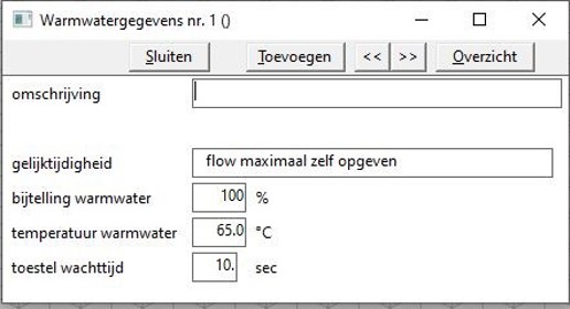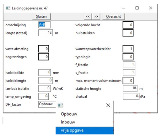 Je kunt aangeven wat de isolatiegegevens zijn van de leiding. Daarna kun je de lengte opgeven welke is geïsoleerd. Laat je de gegevens op 0 staan dan worden de gegevens uit het algemene scherm gebruikt. Dit zelfde geldt ook voor de omgevingstemperatuur . Als laatste kun je kiezen of het programma de DHw,70 _factor van opbouw moet gebruiken, van inbouw, of dat je toch een eigen waarde wilt opgeven.