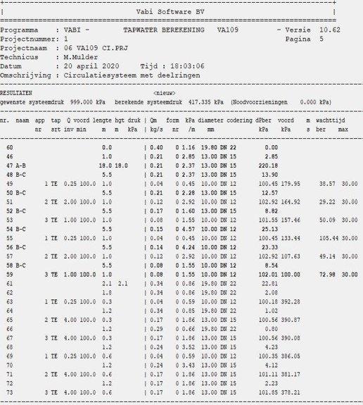 Vervolgens kun je een berekening opstarten. Het programma rekent dan de wachttijd uit van het tappunt tot aan het warmwatertoestel, maar stopt eerder wanneer een ringleiding wordt bereikt of wanneer het een leiding tegenkomt waarop een tappunt voor CV is aangesloten. De uitvoer zal er als volgt uizien:
