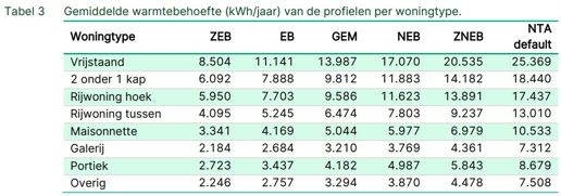 Om de resultaten te kunnen plaatsen, is er eerst gekeken naar de warmtebehoefte voor de verschillende bewonersprofielen in de verschillende type woningen. De warmtebehoefte is van invloed op de uiteindelijke besparing: hoe hoger de behoefte hoe meer er ook bespaard kan worden. Volgens de studie is het verschil in warmtebehoefte tussen bewonersprofiel ZEB en ZNEB een factor 2 à 2,5. De warmtebehoefte van het NTA-profiel is zelfs een factor 2 hoger dan het gemiddelde bewonersprofiel uit het maatwerkadvies.