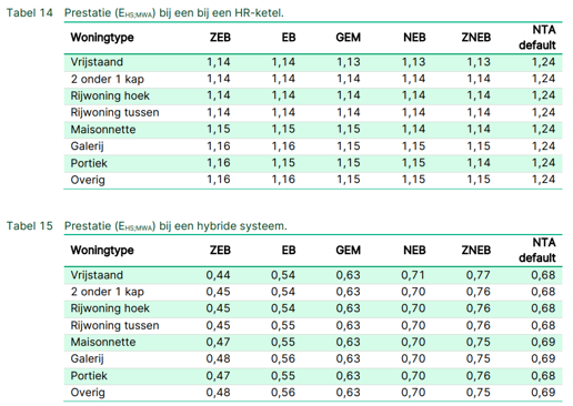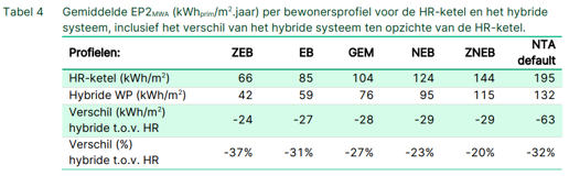 Tabel 4 geeft de resultaten weer van de gemiddelde EP2MWA per bewonersprofiel voor de HR-ketel en het hybride verwarmingssysteem. De EP2MWA wordt op dezelfde manier berekend als de EP2 uit de NTA8800, maar met andere invoerparameters (afkomstig uit het maatwerkadvies).