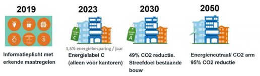 Niet alleen voor woningen worden de eisen strenger; ook de utiliteitsbouw moet straks aan steeds strengere wetgeving voldoen. Zo geldt de informatieplicht met de daarbij behorende erkende maatregelen al sinds vorig jaar. Vanaf 2023 geldt de label-C plicht (alleen voor kantoren > 100 m²)