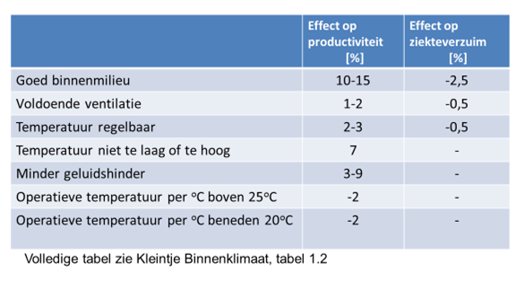 Hieronder vind je een overzicht van het effect van binnenmilieu op de productiviteit en ziekteverzuim in kantoor gebouwen.