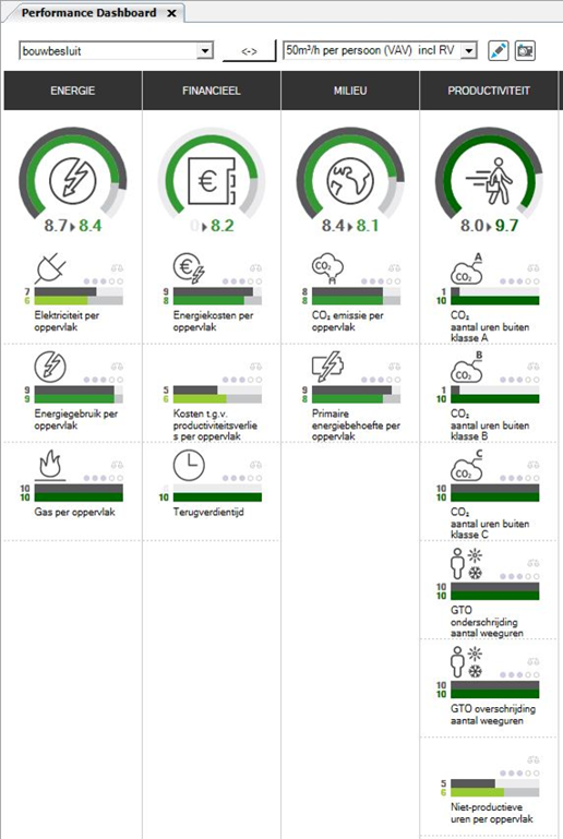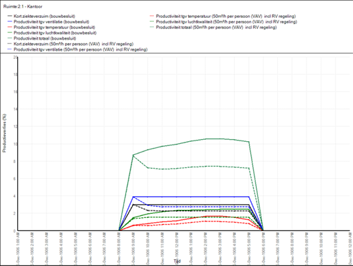 Voor het maken van de volgende uitvoer voorbeelden hebben we een kantoorpand doorgerekend met ventilatiehoeveelheden volgens bouwbesluit en (in een variant) met ventilatiehoeveelheden van 50m³/h per persoon.
