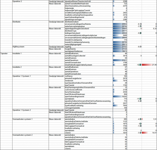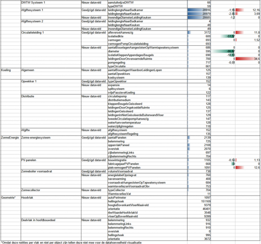 In onze analyse komen zo’n 200 verschillende aangenomen datavelden voor. En omdat het een voorraad van 21.000 woningen betreft, kunnen dit er nog meer zijn. Of een notitie wel of niet tevoorschijn komt heeft namelijk te maken met relevanties. Bijvoorbeeld: de conversie van ventilatiesysteem 2 komt alleen voor bij ventilatiesysteem 1. Bij alle andere ventilatiesystemen is systeem 2 niet relevant en zullen de datavelden hiervan niet relevant zijn. Deze zijn dan niet zichtbaar in de applicatie en hier zijn dan ook geen conversienotities van.