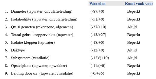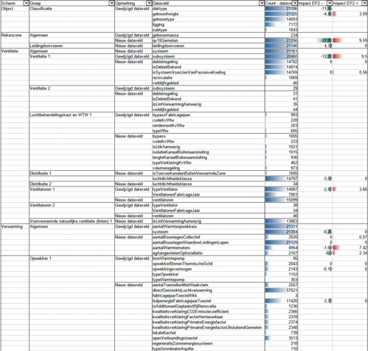 Nog niet alles is berekend, maar wat opvalt is dat er meer dan 20 datavelden zijn, waarbij het effect op de EP 2 minder dan 1 kWh/m2 is. Bij meer dan 40 datavelden is het effect minder dan 10 kWh/m2.