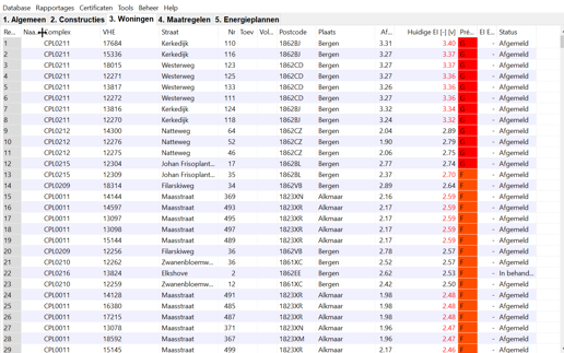 Bij deze punten kan het voorkomen dat er geen goede conversie kan plaatsvinden, of dat er geen juiste data uit komen. Heb je nu je data zoveel mogelijk up-to-date, scheelt dat bewerken achteraf. Over het algemeen geldt: staat de EI in Vabi Assets Energie in het rood, dan kan het zijn dat je de data na de conversie nog moet aanpassen. De data gaan mee met de conversie, dus ook achteraf kun je hier nog aandacht aan besteden. Ga je nog niet direct nieuwe energielabels laten registreren, dan kun je voordat je de nieuwe software installeert nog kijken welke woningen een rode EI hebben en bepalen welke gegevens hiervoor ontbreken.