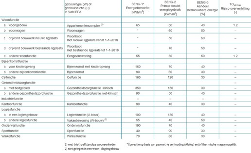 Net als bij de EPC heeft iedere gebruiksfunctie zijn eigen eisen. De eisen zijn per type gebouw verschillend. In onderstaand schema is te zien welke eisen er voor welk gebouw gelden. Voor veel functies is er een getrapte BENG-eis, die gekoppeld is aan de compactheid van het gebouw.