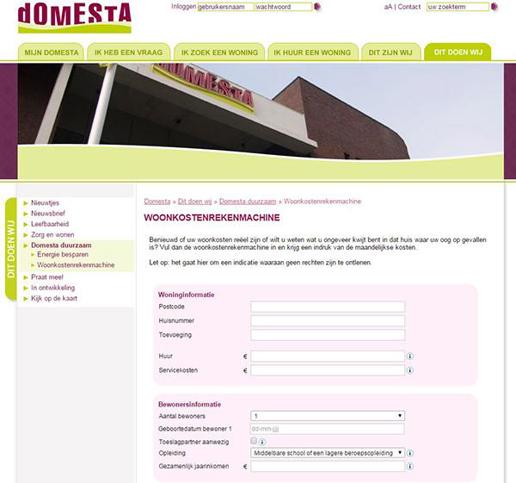 Domestahttps://www.domesta.nl/is als corporatie actief in Zuid-Oost Drenthe en hanteert in haar verhuurproces het optiemodel. Zij hebben daarom gekozen om woonlasten te tonen via de eigen website in plaats van een woonruimtebemiddelingssysteem. Huurders en woningzoekenden kunnen op de website van Domesta eenvoudig zelf hun woonlasten berekenen voor elke gewenste woning door middel van de woonkostenrekenmachine. De rekenmachine vraagt om bewonersinformatie en vult deze aan met woningkenmerken uit het systeem. Op basis hiervan wordt een indicatie van de persoonlijke woonlasten gegeven.