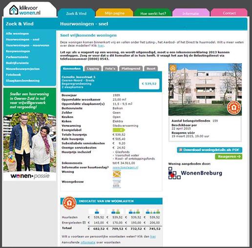 Klik voor Wonen bemiddelt in het verhuren en verkopen van woonruimten van zeven corporaties in West-Brabant. De indicatie van de woonlasten wordt automatisch getoond voor vier verschillende typen huishoudens. Een woningzoekende heeft ook de mogelijkheid om in te loggen, waarna een indicatie van de persoonlijke woonlasten gegeven wordt.