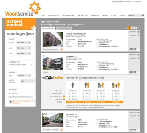 Ook WoonService Den Bosch toont woonlasten in het woonruimteverdeelsysteem. WoonService toont voor een aantal woningcorporaties een uitsplitsing van woonlasten in kale huur, servicekosten, kosten voor gas, water en licht en heffingen. Bij elke woning zijn de woonlasten van vier huishoudensgroepen berekend.