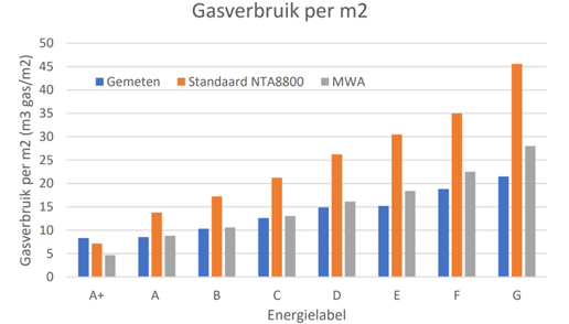 Een belangrijk doel van maatwerkadvies is om tot je juiste berekende energieverbruiken te komen. De NTA 8800 is daar niet geschikt voor, omdat er gekeken wordt naar het gemiddelde gebouw gebonden verbruik. De volgende afbeelding toont de prestatiekloof tussen de gemeten energieverbruiken, de NTA 8800 en het maatwerkadvies.