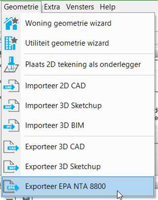 De bestaande feature in Vabi Elements bevindt zich onder de Geometrie > Exporteer Vabi EPA: