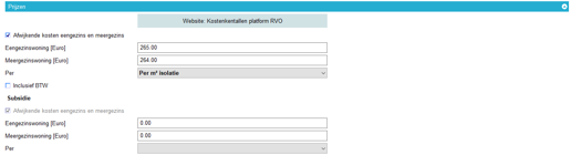 Bij elke maatregel kunnen de bijhorende kosten en subsidies worden ingevoerd. Voor de bepaling van de kosten kan gebruik gemaakt worden van het kostenkentallen platform van de overheid. Bij het invoerscherm van de prijzen is er een directe link beschikbaar naar deze website. Op dit platform zijn de kosten van een groot aantal veelvoorkomende maatregelen terug te vinden. De kosten zijn terug te vinden voor verschillende situaties en type woningen en worden uitgesplitst in de verschillende onderdelen. Met deze informatie kan dan een goede inschatting gemaakt worden welke kosten van toepassing zullen zijn voor het project waarvoor het Maatwerkadvies wordt opgesteld.