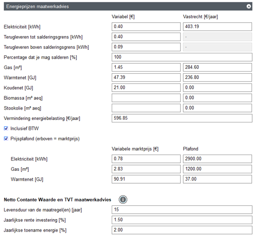 Er zijn twee kosten die een rol spelen in het Maatwerkadvies: de kosten van de maatregelen die worden uitgevoerd en de energieprijzen. Beiden zijn in te voeren in de berekening voor het Maatwerkadvies.
