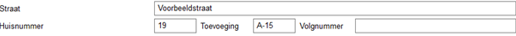 Is het adres goed ingevuld? Krijg je een foutmelding over het adres, check dan als eerste online met behulp van het BAG nummer of deze klopt en goed is ingevuld. Het adres “Voorbeeldstraat 19 A 15” geef je bijvoorbeeld als volgt op: