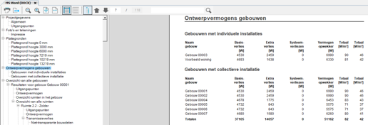 Nu kan je een compleet gebouwcomplex doorrekenen, waarbij direct de resultaten voor élk gebouw in de uitvoer komen. Daarnaast worden de ontwerpvermogens voor de individuele installaties en de collectieve installatie berekend. Voor de begane grond van het bijgeleverde voorbeeldproject ziet dit er in de resultaten zo uit: