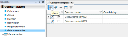 Om meerdere gebouwen met individuele en/of collectieve installatie door te kunnen rekenen, geef je aan bij welk gebouwcomplex de gebouwen horen. Je kan een nieuw gebouwcomplex maken bij Eigenschappen – Gebouwcomplex: