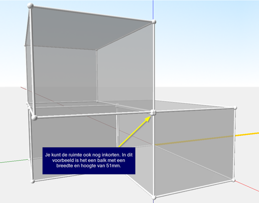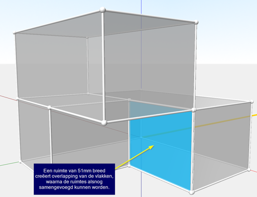 Een tweede manier is om juist een stukje overlap te creëren. Zo raken de ruimtes elkaar niet meer alleen op één lijn, maar delen ze een klein vlak. Maak bijvoorbeeld een overlap van 51 mm breed. Zo voorkom je rode puntjes en wordt de verbinding tussen de ruimtes herkend als één geheel.
