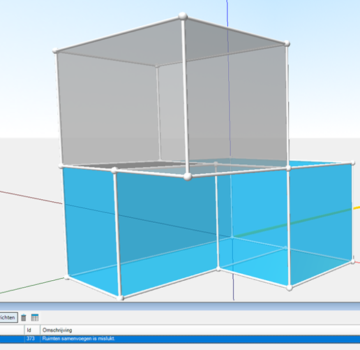 Vabi Elements kan alleen ruimtes samenvoegen die een vlak delen. Een lijnverbinding telt dus niet mee, zelfs niet als de rest van de ruimte wel overlapt.
