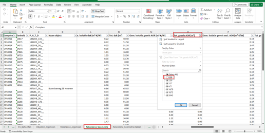 Om welke woningen dit gaat is snel te achterhalen in Excel middels de export alle datavelden. Bij het selecteren van de woningen voor deze export, kan al gekozen worden om alleen de objecten mee te nemen met een E, F, of G label. In de Excel export alle datavelden is er een kolom die aangeeft wat de totale oppervlakte van een woning is dat grenst aan een AOR. Door hier de waarde ‘0.0’ uit te filteren, verkrijg je snel een overzicht van de objecten die een begrenzing aan AOR hebben: