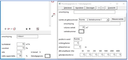 Het bovenste gedeelte is de standaard invoer voor een rooster welke je ook ingeeft wanneer je geen geluidsberekening maakt. Het middelste gedeelte is de invoer voor een ruimte. Er kunnen nu dus meerdere ruimten zijn met hetzelfde vertreknummer en hetzelfde volume, b.v. wanneer ze dezelfde eisen hebben. Het onderste gedeelte zijn de geluidsinvoer gegevens van een rooster op een bepaalde plaats in het stelsel. In bovenstaande ruimte indeling kunnen de geluidsinvoer gegevens weer helemaal gelijk worden.