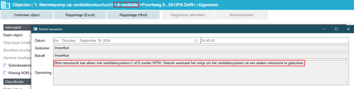 - Warmtepomp met bron anders dan ventilatieretourlucht in combinatie met ventilatiesysteem D met WTW. Doordat de bron anders dan ventilatieretourlucht (bij tapwater) is rekent het bestand wel door. Een andere optie is om de bron terug te zetten naar ventilatieretourlucht en de WTW uit te zetten bij ventilatiesysteem D.