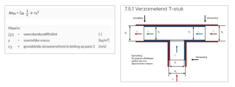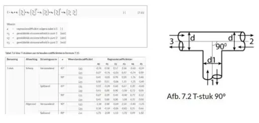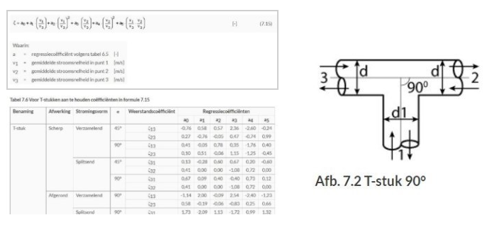 In recente projecten die ter controle binnenkwamen bleken de berekeningen van T-stukken helemaal uit te staan. Dit kun je zien in het figuur T-stuk. Dit kan voor de uiteindelijk berekening nooit de bedoeling zijn, tenzij je bij de totale druk een percentage toevoegt voor compensatie. In andere programma’s wordt de leidinglengte aangepast om deze hulpstukken te compenseren. Dat is ook mogelijk in ons programma (Va100 en Va109). Hierin zitten formules verwerkt volgens ISSO 18.