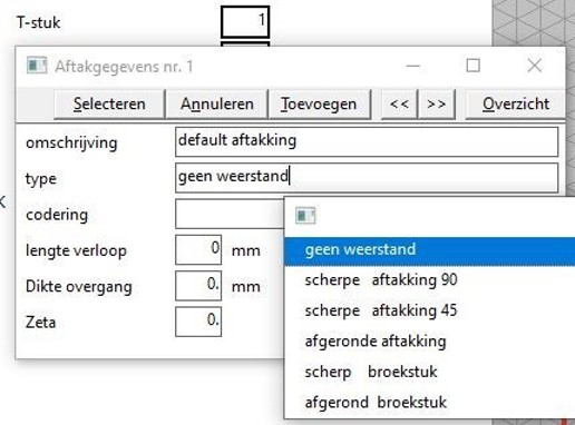 Een andere mogelijkheid is om een zeta waarde in te vullen. Zet het type dan weer op geen weerstand en vul alleen een waarde in bij de zeta, dan wordt alleen de zeta vermenigvuldigd met het kwadraat van de snelheid van de ingaande leiding. Op deze manier kan een zeta van een fabrikant worden gebruikt. Dit zijn soms zeta-waarden bij een bepaalde ingaande snelheid en ook bepaalde diameters. Verandert een van de drie diameters van een T-stuk of de flow door een van de takken, zodat de snelheden veranderen dan wordt deze zeta al moeilijker te gebruiken. Eigenlijk zouden dan per fabrikant 6 parameters per T-stuk meegegeven moeten worden.