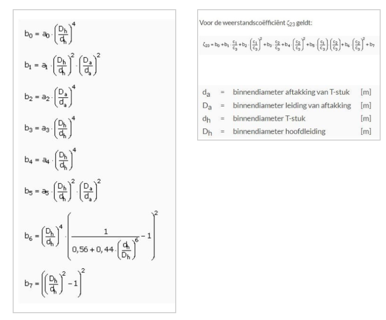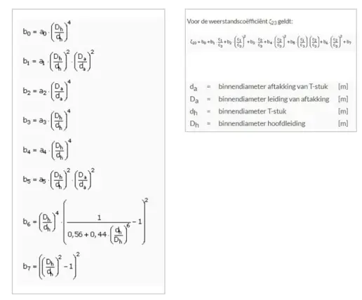 Kies je een van de andere opties uit bovenstaande figuur, dan heeft het programma bijbehorende parameters om dit uit te rekenen. We nemen nu als voorbeeld een scherpe aftakking 90Gr. In de praktijk zijn er ook vaak vernauwingen die een grote invloed op de weerstand kunnen hebben. Hiervoor is in ons programma een invoeritem ingevoerd welke de vernauwing aangeeft, dus de vermindering van de diameter op de plaats van de aansluiting van de leiding met het T-stuk. Bij deze vernauwing wordt de volgende formule gebruikt.