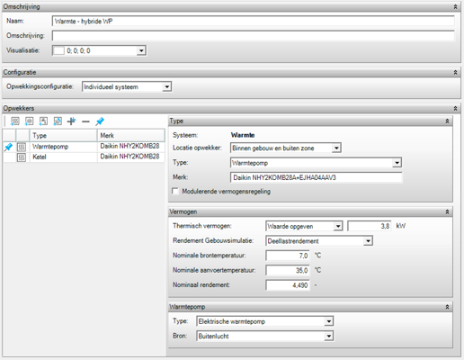 Voor een koellast- of warmteverlies berekening hoeven/kunnen geen opwekkers te worden ingevoerd. Voor gebouwsimulatie uiteraard wél. Hoe moet nu de hybride warmtepomp worden ingevoerd?
