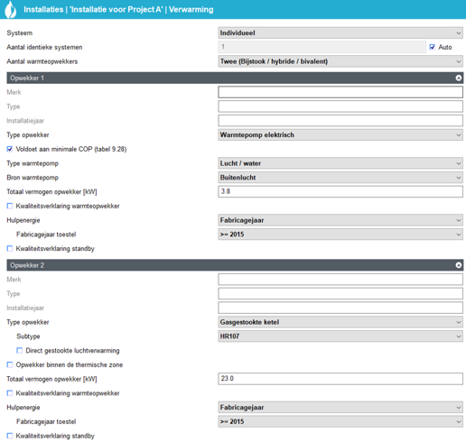Bij de opwekker voor verwarming dient men 2 opwekkers in te voeren: