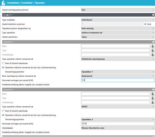 Als er ook een Energie & Kosten berekening wordt gemaakt dan dient er bij projectgegevens tapwater aangegeven te voeren welk deel van het tapwater elektrisch wordt verwarmd en welk deel aanvullend met gas en uiteraard behoren hier ook de rendementen te worden ingevuld.