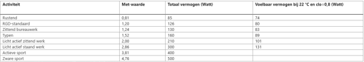 In de tabel hieronder zie je de activiteit die een wattage per persoon en een metabolisme bevatten.